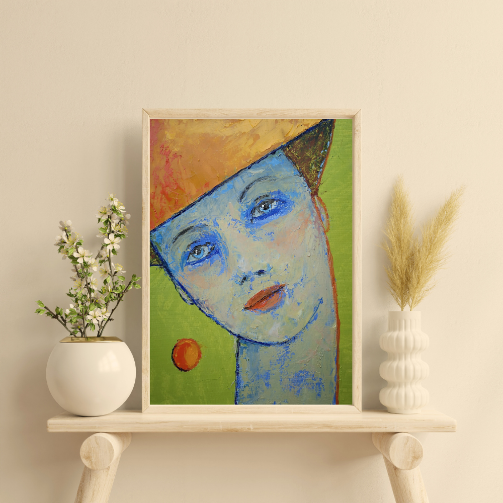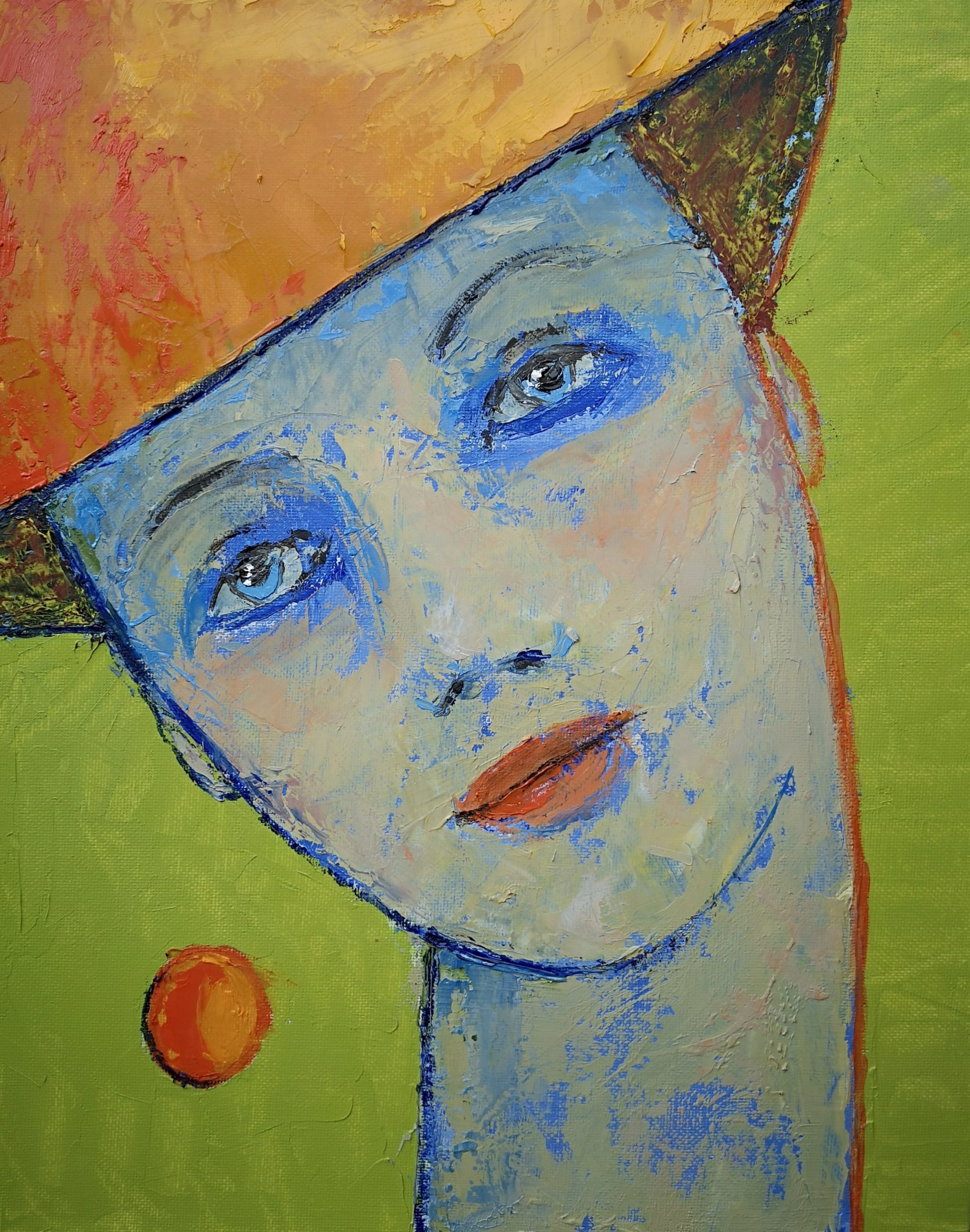 If Only I’d Known is one of my Grace N’ Grit girls that I particularly like. She suggests both openness, curiosity and sensitivity, and yet she is strong. I chose a deliberately playful palette tinged with emotion — the lime green background and warm orange hat balancing against the cool blues of the face.