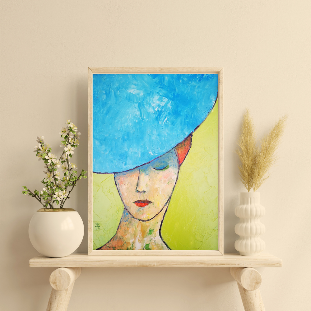 I painted this figure with her eyes lowered, half hidden beneath the sweeping brim, to suggest introspection and stillness.  I wanted the balance of delicacy and boldness (Grace N’ Grit) to hold the viewer’s attention, letting them settle down in the calm of her expression.