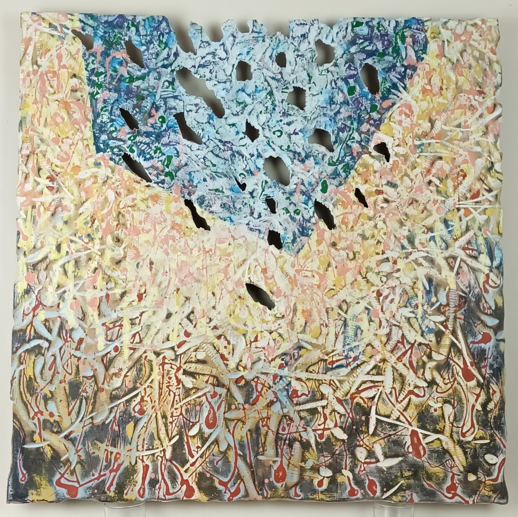Straight lines of geometric form meet the wiggles and squiggles of organic life. Is it below the sea? Is it microscopic? Or is it enormous? Is it even real? A reminder of the brevity of life and even the brevity of mankind’s time.