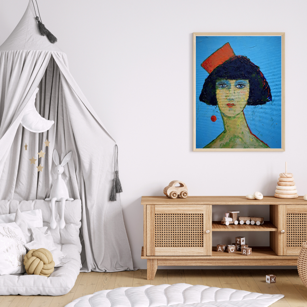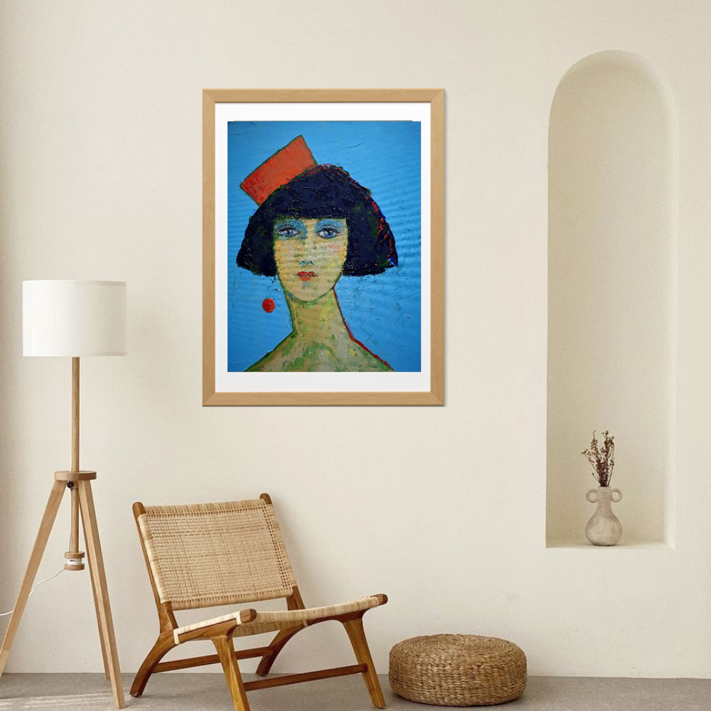 ‘Red Pillbox Hat’ is a painting of someone who is possibly not aware of quite how much of an impression she makes – she is almost not wholly present. She is young and experimenting with life, still slightly wary, but safe in her own world.