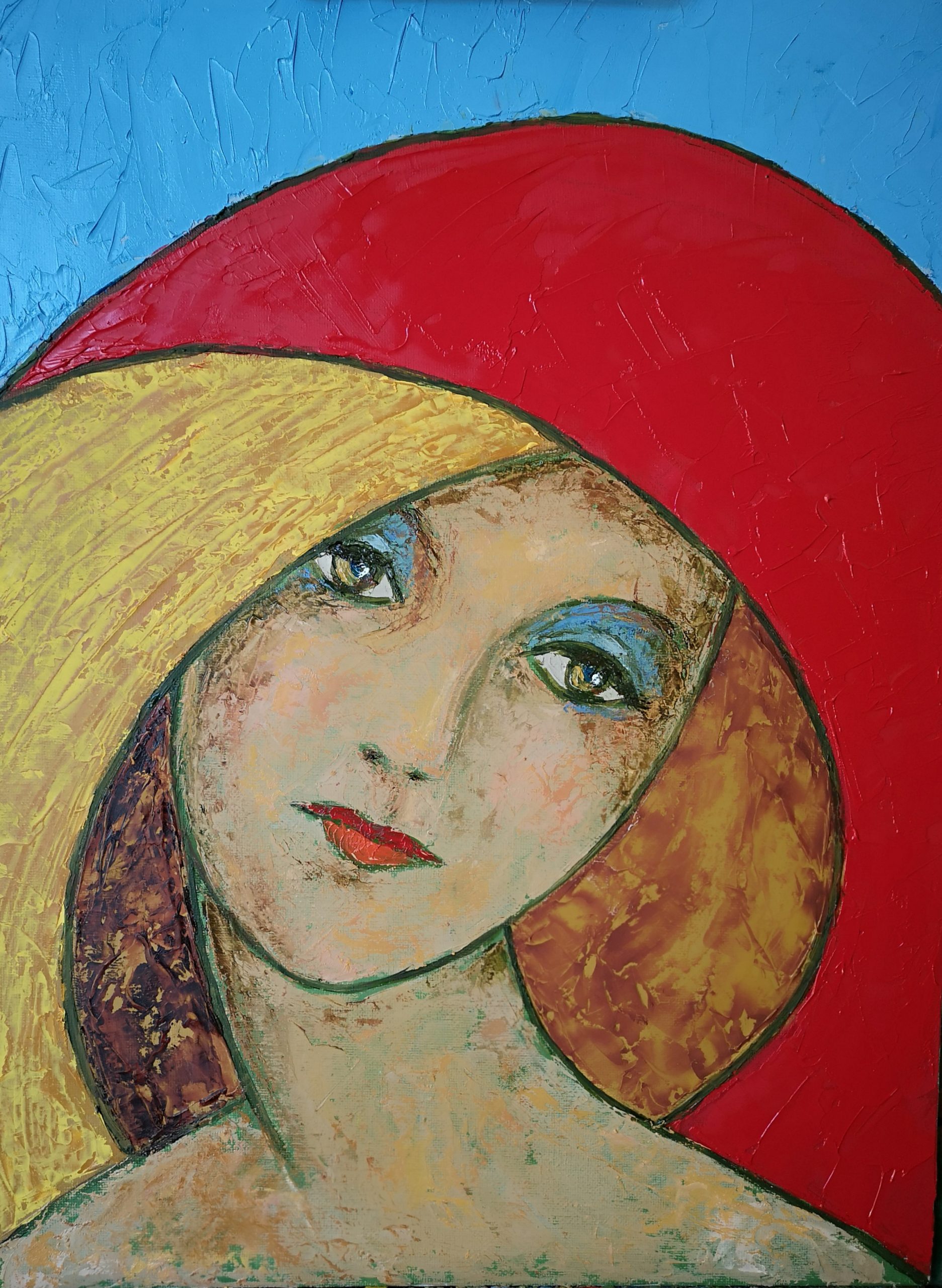 The Red Shawl is one of my Grace n’ Grit girls who feels it all, yet is tough (in a rather resigned way). She’s almost given up on the hope of experiencing pure joy – but not quite! She finds joy in expressing herself however she wants to, to the world. This was painted in oils using a palette knife, and brings together bold colour, graceful lines, and a timeless expression — a portrait that feels both classic and contemporary.