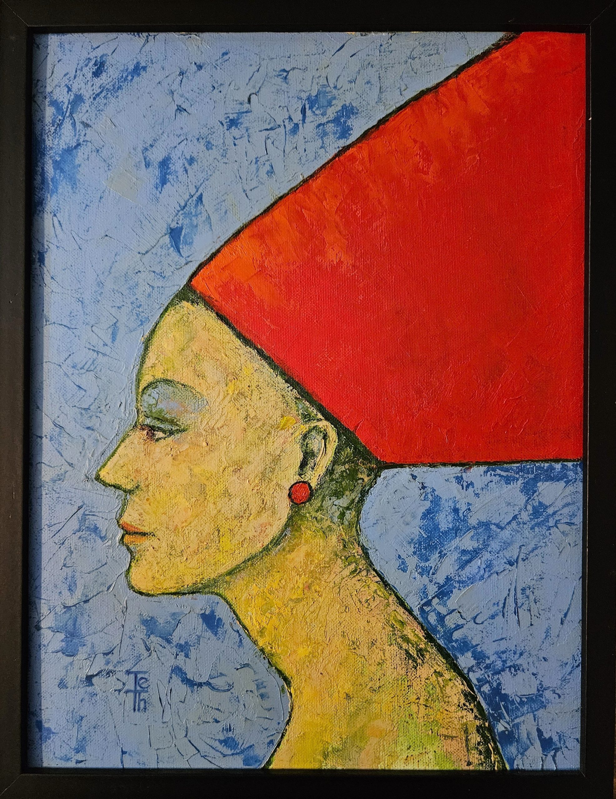 Tall Red Hat was born from my love of strong shapes and bold contrasts.  The face is soft and is in sharp contrast to the sharp geometry of the hat.
